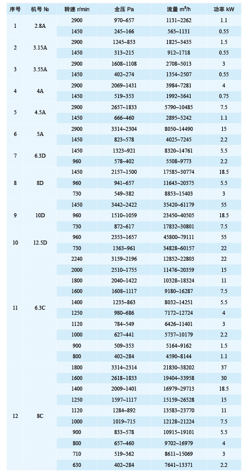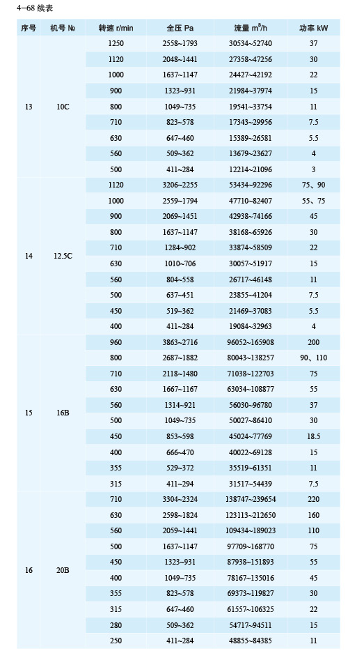4-68通風(fēng)機(jī)和引風(fēng)機(jī)均為單吸入,有8#、9#、10#、11.2#、12.5#、14#、16#共七個機(jī)號。每種風(fēng)機(jī)均可制成右旋或左旋兩種形式。風(fēng)機(jī)的傳動方式均為D式,電機(jī)與風(fēng)機(jī)聯(lián)接采用彈性聯(lián)軸器直聯(lián)傳動。